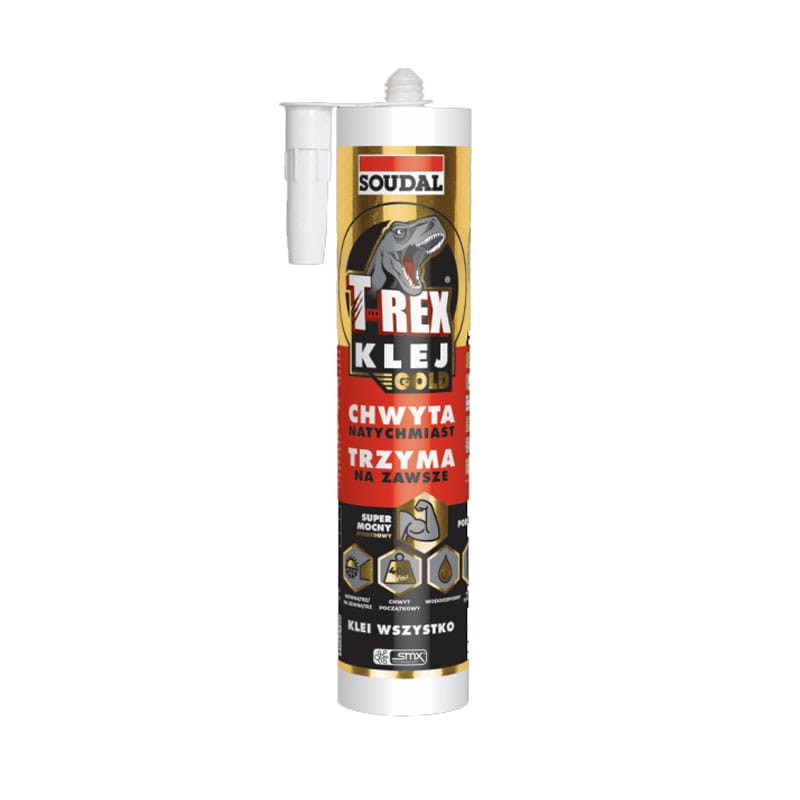 T-REX GOLD HYBRYDOWY to trwale elastyczny klej montażowy o ekstremalnie wysokiej sile spojenia początkowego (do 400 kg/m² już w 1 sek. od dociśnięcia) i wyjątkowo mocnym wiązaniu.