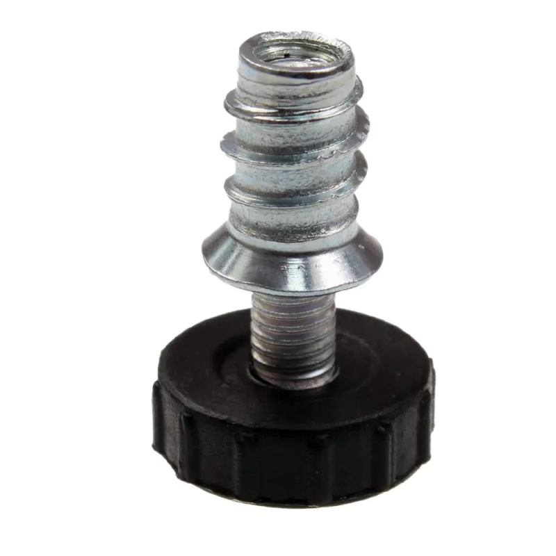 Montaż elementu jest prosty – mufa osadzana jest w przygotowanym otworze, a następnie wkręcany jest trzpień regulacyjny. Takie rozwiązanie umożliwia wielokrotną regulację bez utraty stabilności połączenia.
