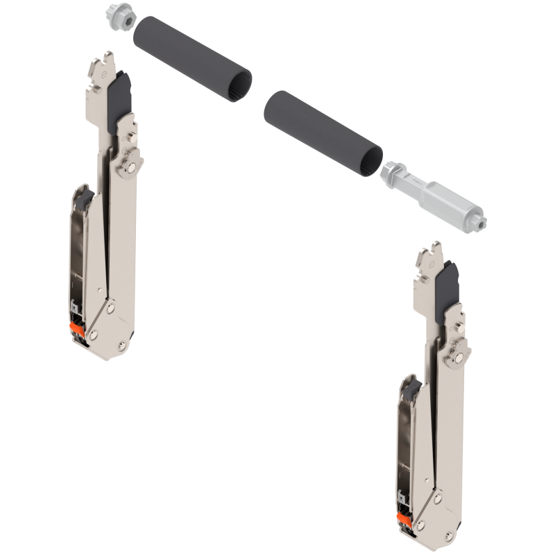 Zestaw ramion teleskopowy przeznaczonych do siłowników AVENTOS HL TOP firmy BLUM. Podnośniki teleskopowe znajdą zastosowanie do frontów otwieranych nad korpusem.