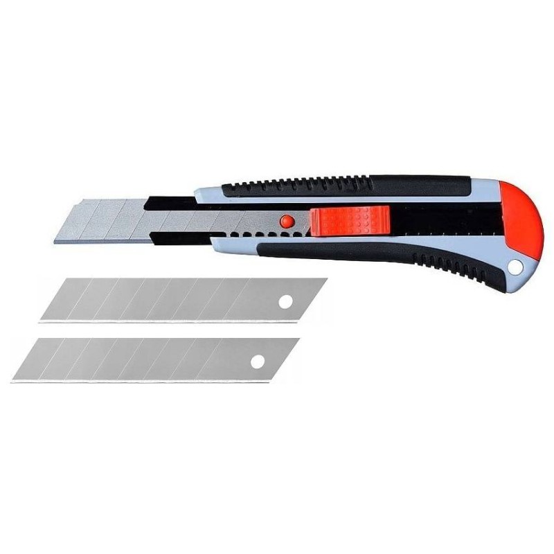 Nóż posiada antypoślizgową i dwukomponentową rękojeść SOFT-GRIP dla większego komfortu użytkowania, na szczycie rękojeści znajduje wbudowany łamacz ostrzy do bezpiecznego odłamywania segmentów ostrzy, mocna blokada ostrza oraz możliwość zawieszenia, posiada wbudowany magazynek na ostrza wymienne, na odłamywane ostrze o szerokości 18 mm, można też zastosować ostrza bez segmentów, w komplecie z nożem: 1 ostrze złożone w nożu oraz 2 x ostrza wymienne umieszczone w specjalnym magazynku w korpusie noża.