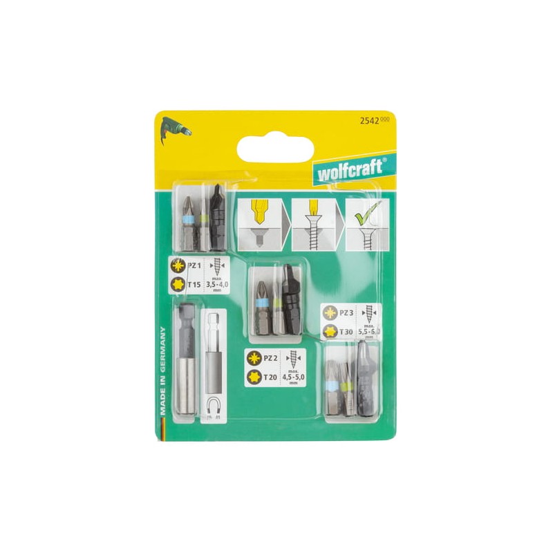 Do drewna Trzpień sześciokątny 1 x uchwyt do końcówek, z magnesem 3 x pogłębiacze, Ø8, 10, 12 mm 3 x końcówki Solid Pozidriv PZ1, PZ2, PZ3 3 x końcówki Solid Torx TX15, TX20, TX30
