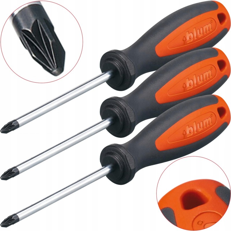 Profesjonalny śrubokręt krzyżakowy Blum stworzony z myślą o precyzyjnej regulacji i montażu zawiasów oraz prowadnic. Ergonomiczna rękojeść i idealnie dopasowana końcówka zapewniają wygodę pracy i pełną kontrolę nad ustawieniami okuć.