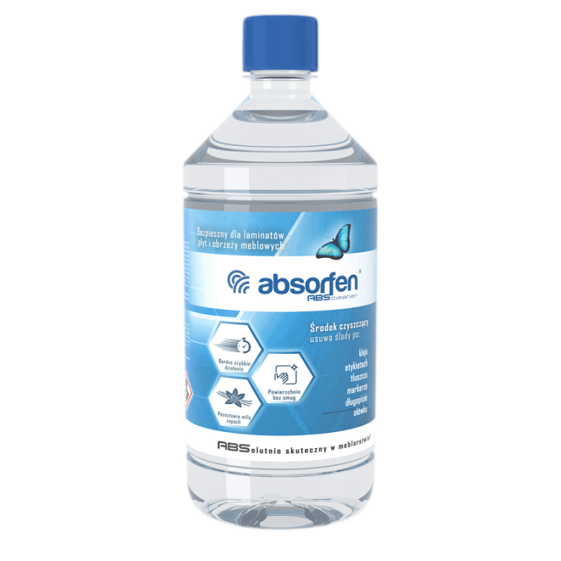 ABSORFEN ABS CLEANER to skuteczny środek do czyszczenia płyt meblowych z obrzeżem ABS, płyt kompaktowych, PVC oraz profili powlekanych folią i poliuretanowych. Usuwa resztki kleju, tłuszcz, kurz, ślady po markerze, gumie, piance czy smole. Bezpieczny dla laminatów i obrzeży – nie matowi powierzchni. Zawiera składnik antystatyczny, który chroni przed ponownym zabrudzeniem. Szybko schnie, pozostawiając powierzchnię czystą i estetyczną.