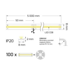 Design Light Taśma LED COB 5m X 8mm Ip20 Biała Ciep 12,8W/m