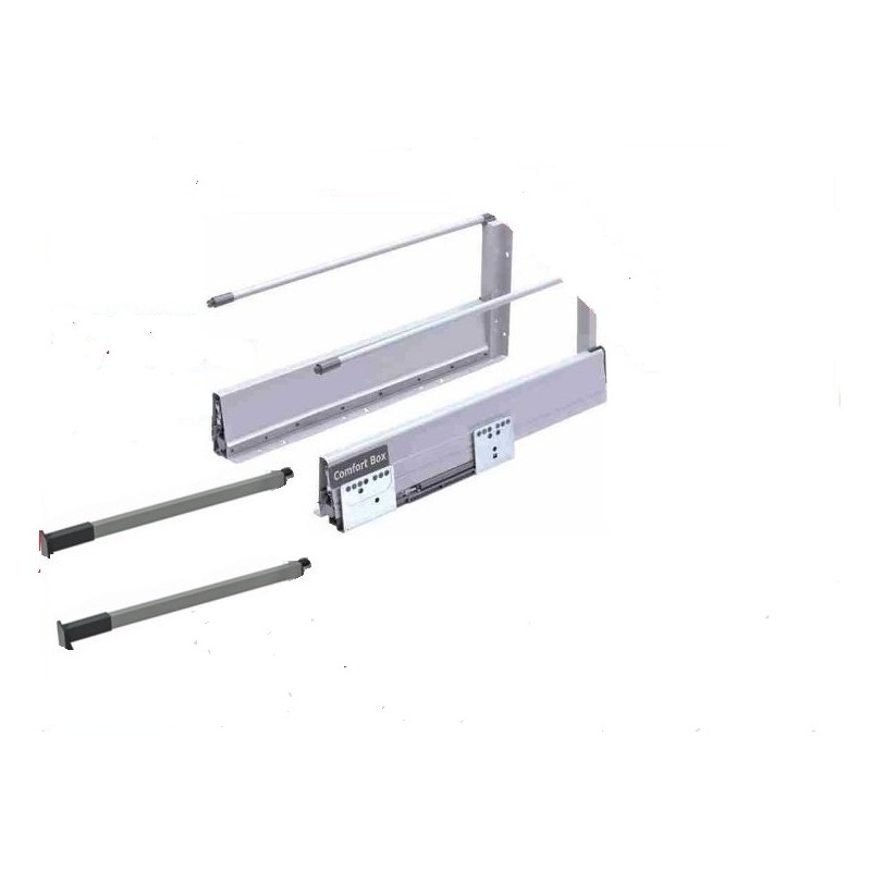 Szuflady Comfort Box frontowe stanową wyposażenie szafek kuchennych. Szuflady te wymagają zamontowania do nich własnego frontu. Proponowany system szufladowy to jednak przede wszystkim rozwiązanie praktyczne. Pełny, niemal bezszelestny wysuw szuflady umożliwia łatwy dostęp do przechowywanych w niej przedmiotów. Zastosowany w szufladach Comfort Box miękki dociąg eliminuje także niedomykanie się szuflad. Zintegrowana regulacja frontu 3D znacząco ułatwia montaż przedniej części szuflady.